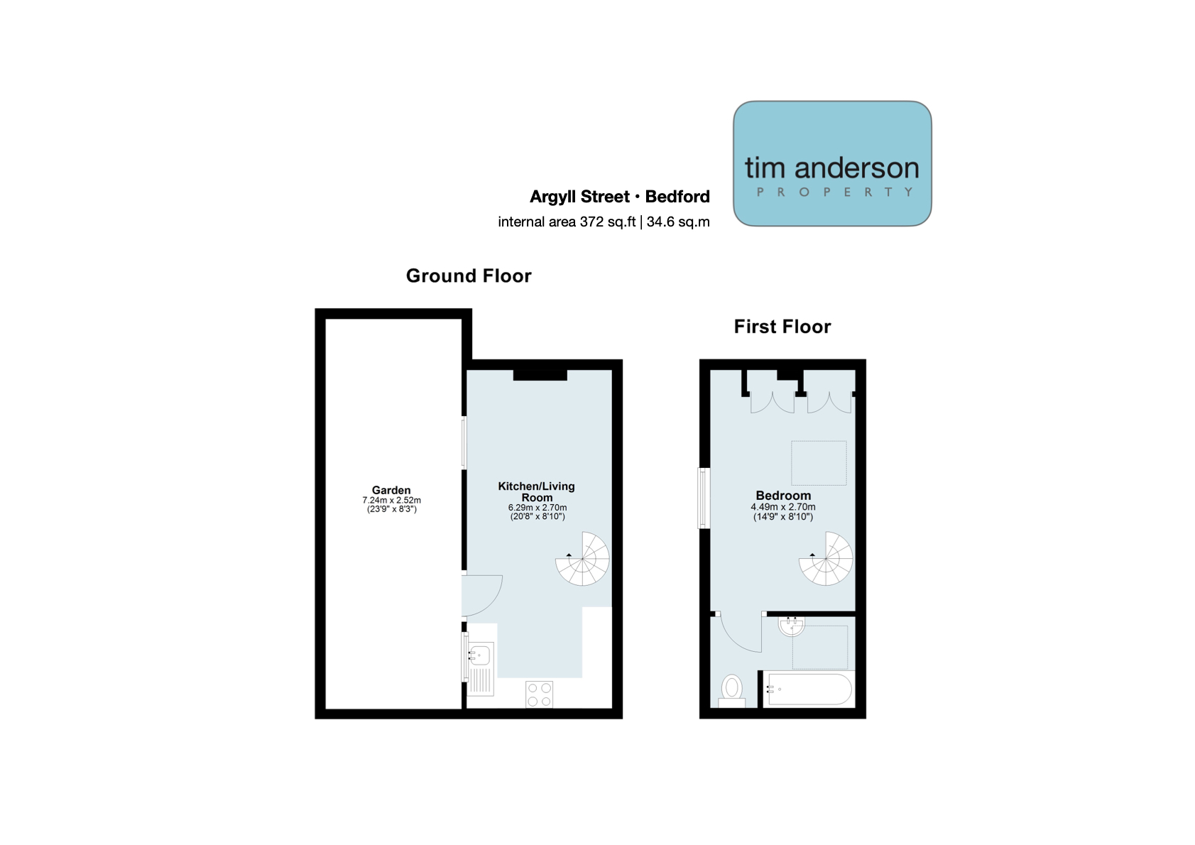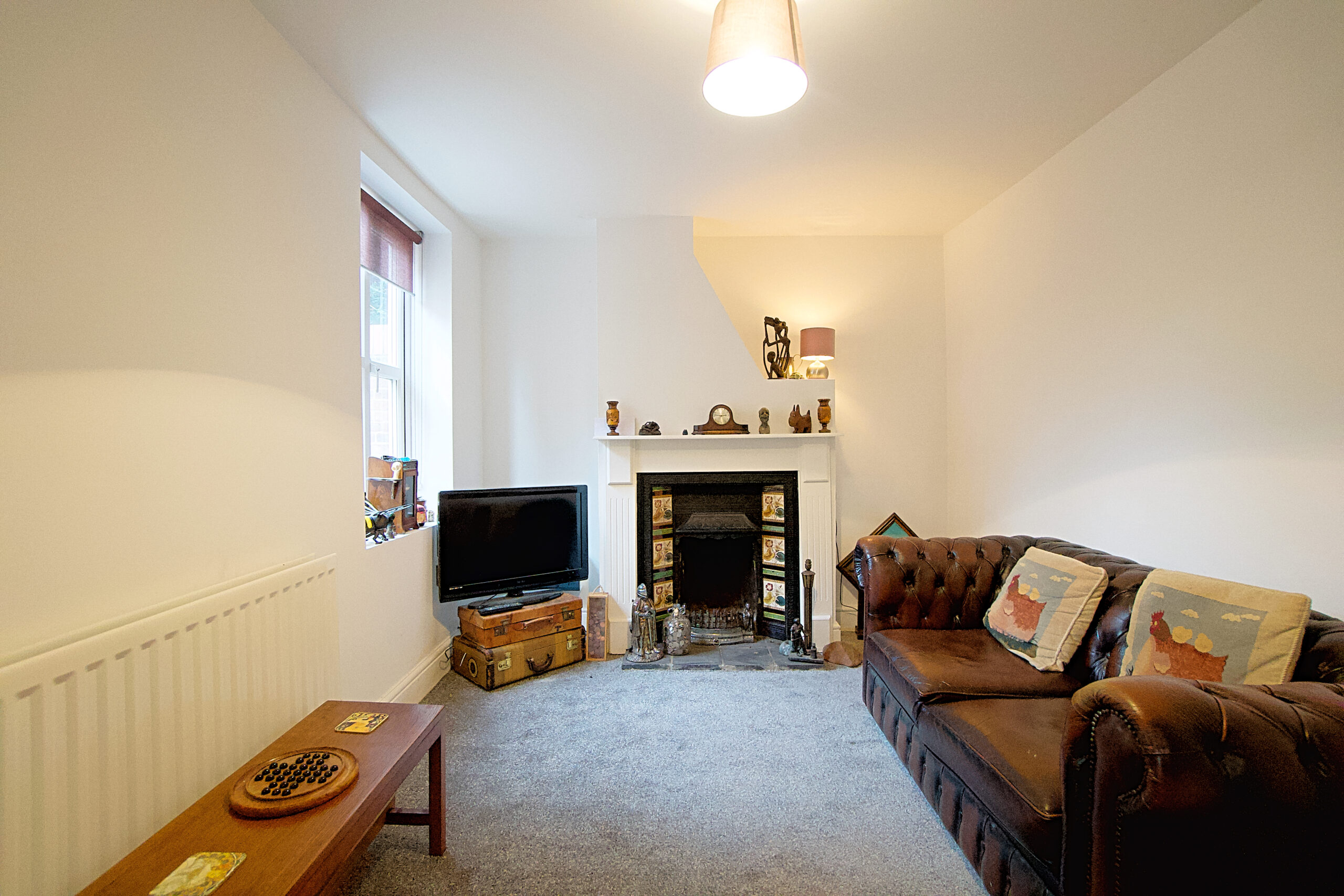 The new lino becomes new carpet and it’s the living room. There is a lovely working Victorian fireplace as a focal point and an iron spiral staircase to the first floor.