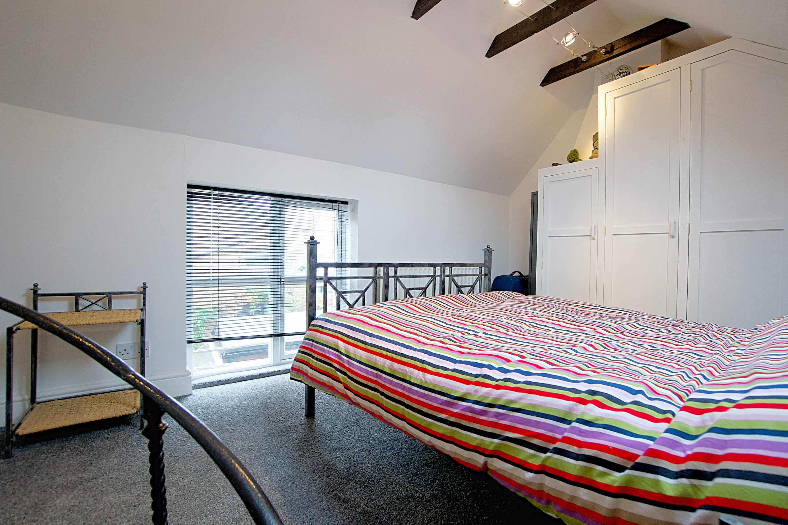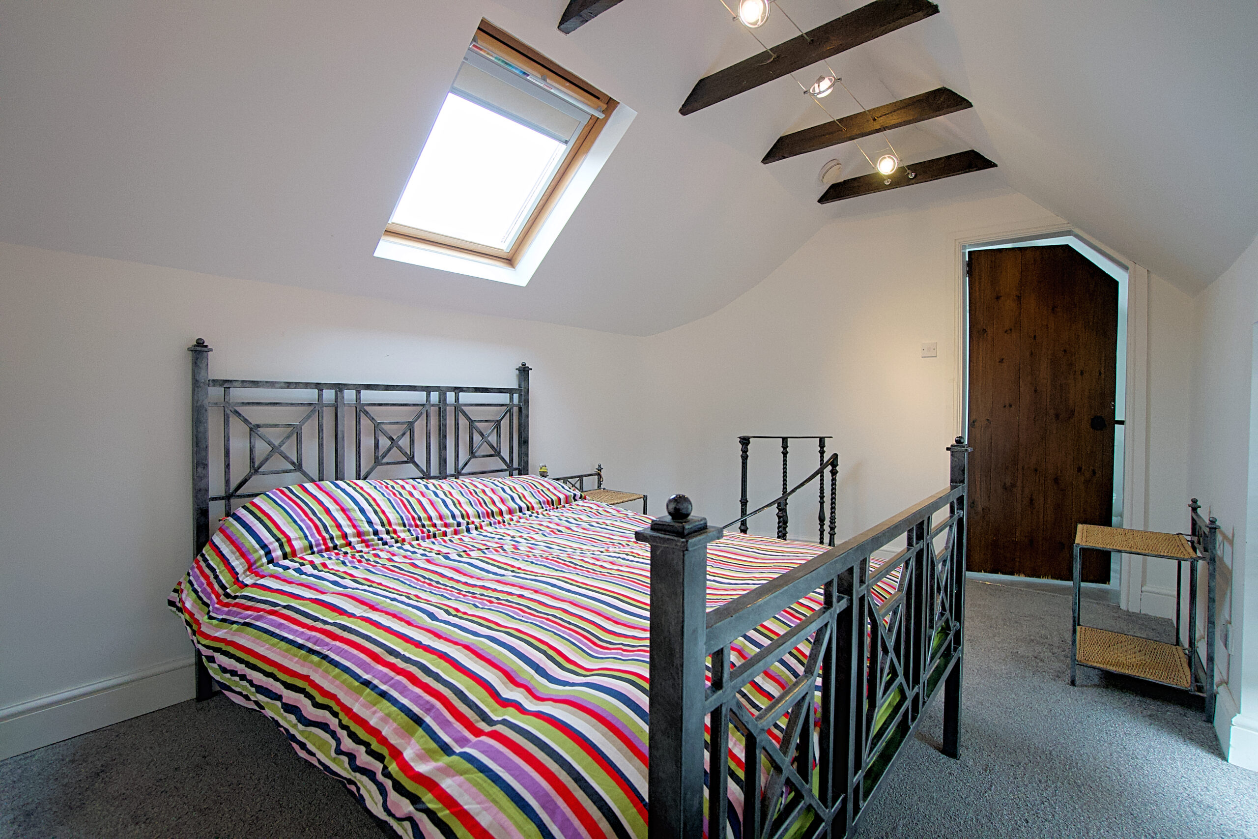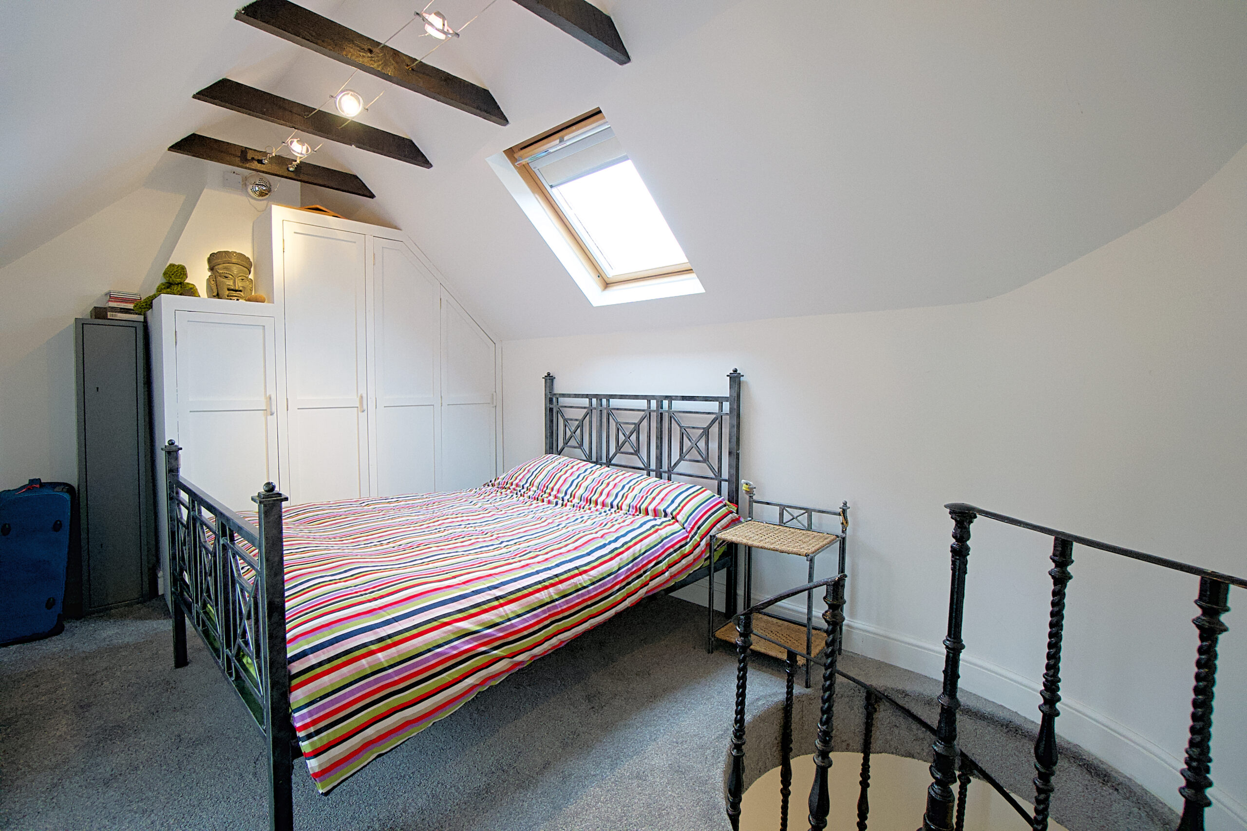 Straight into the bedroom with its vaulted ceiling, Velux and window. There are fitted wardrobes on the far wall and door to bathroom.