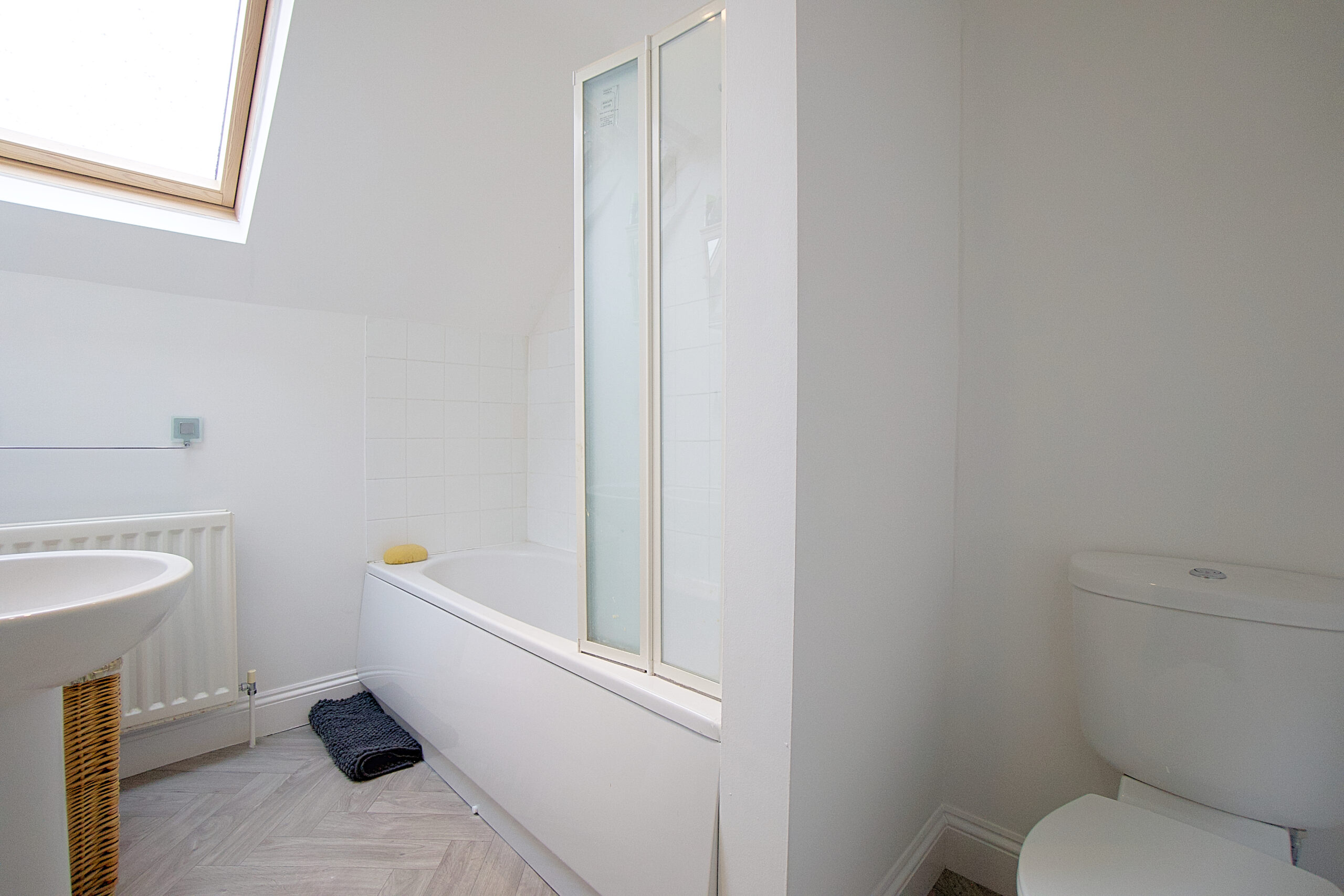 White suite and white walls keep the clean theme of the property running. The bathroom has been upgraded too; new taps, shower and flooring with a shower over the bath and there is a velux for light and ventilation.