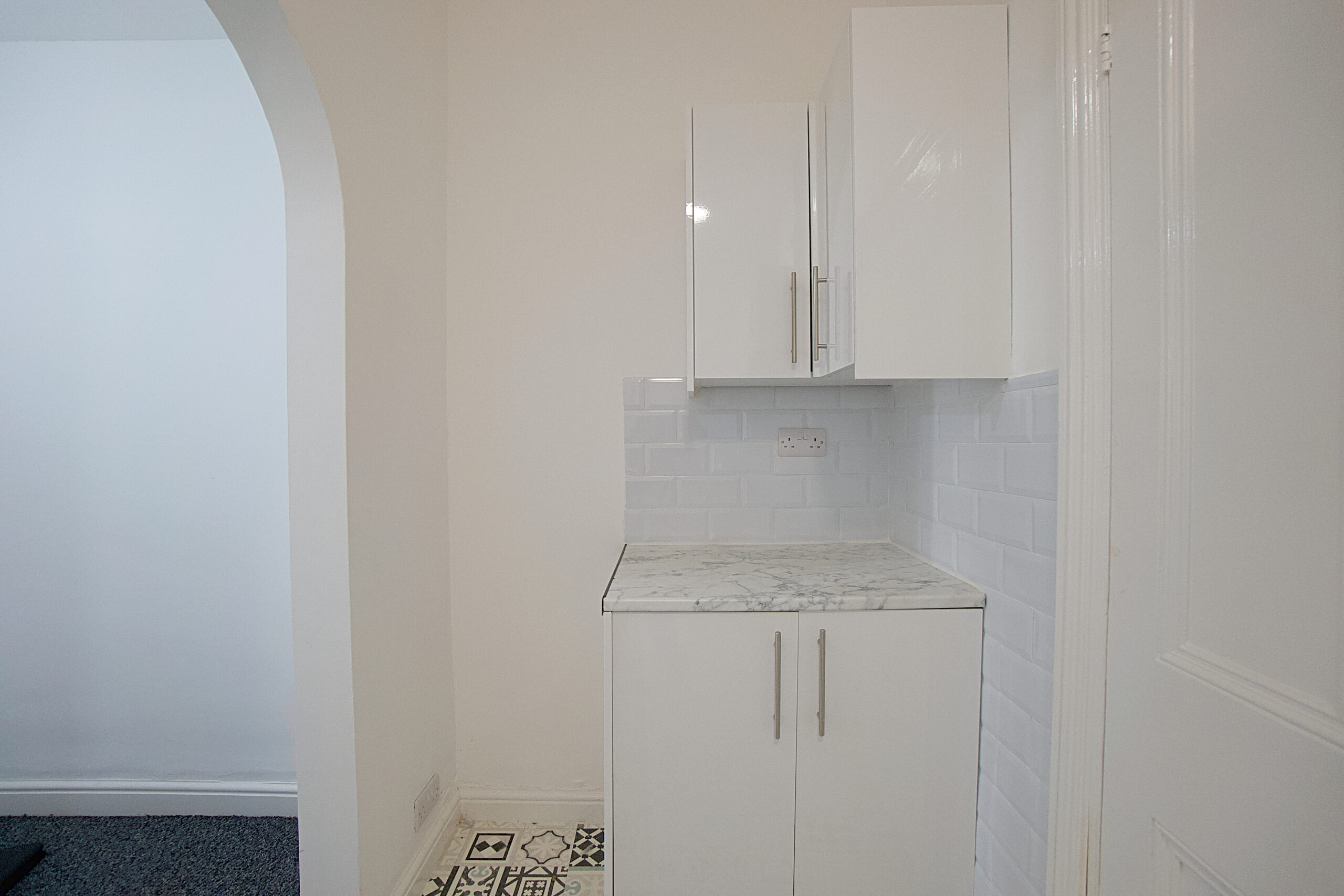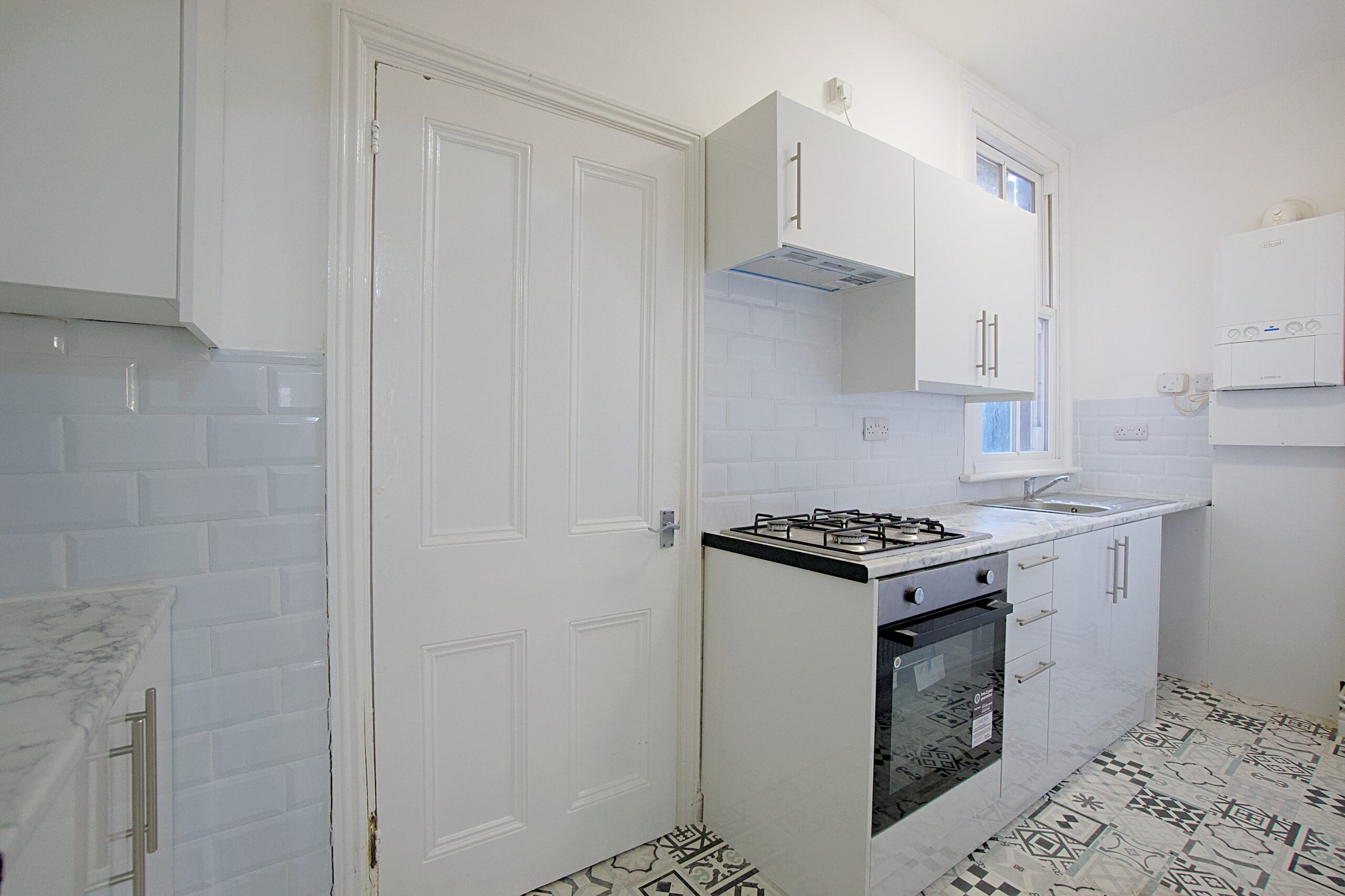 Behind sits the kitchen. A wide space with marble effect worktop and white fronted cabinets. The gas hob and oven are new and there is plumbing for a washing machine and space for a fridge freezer.