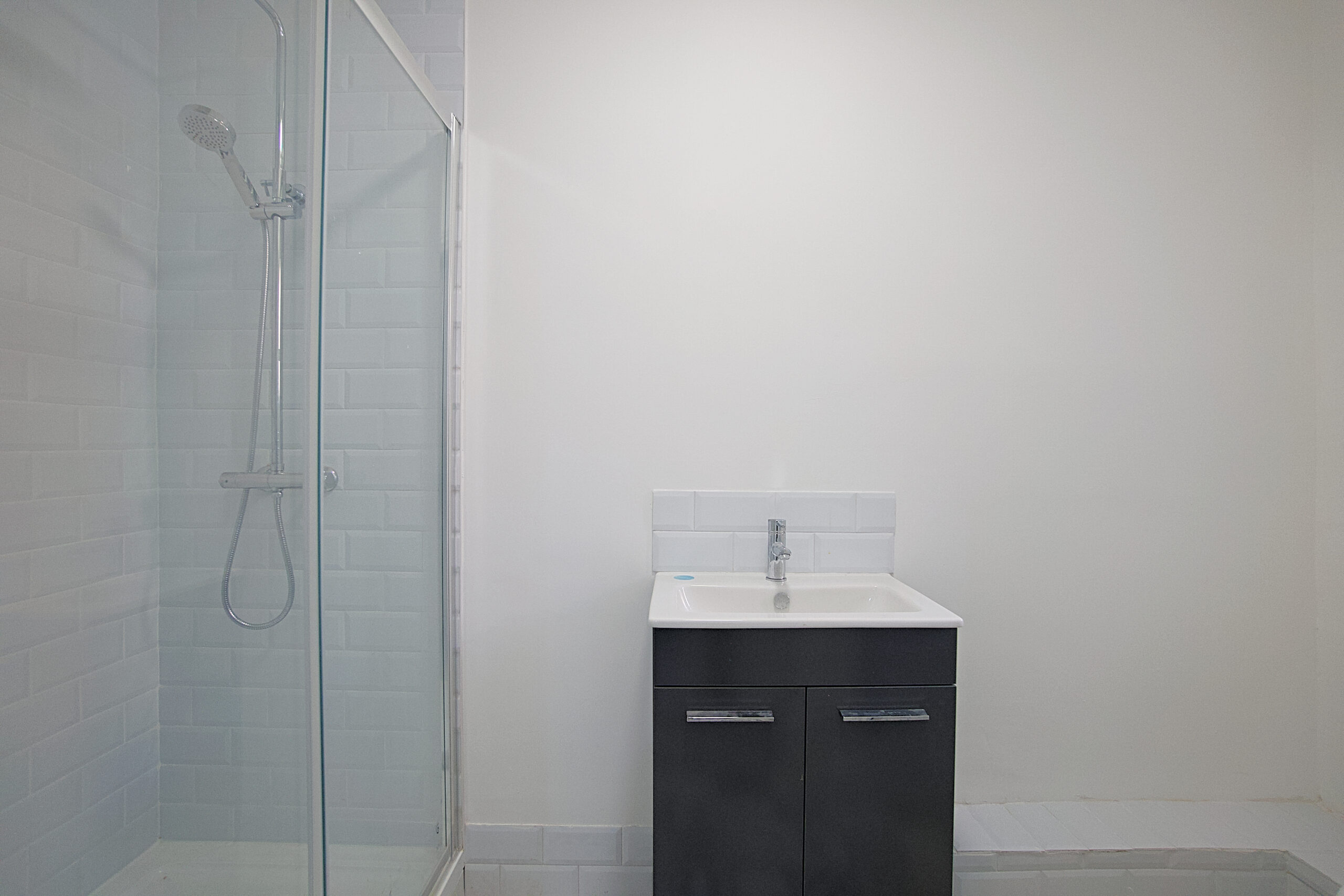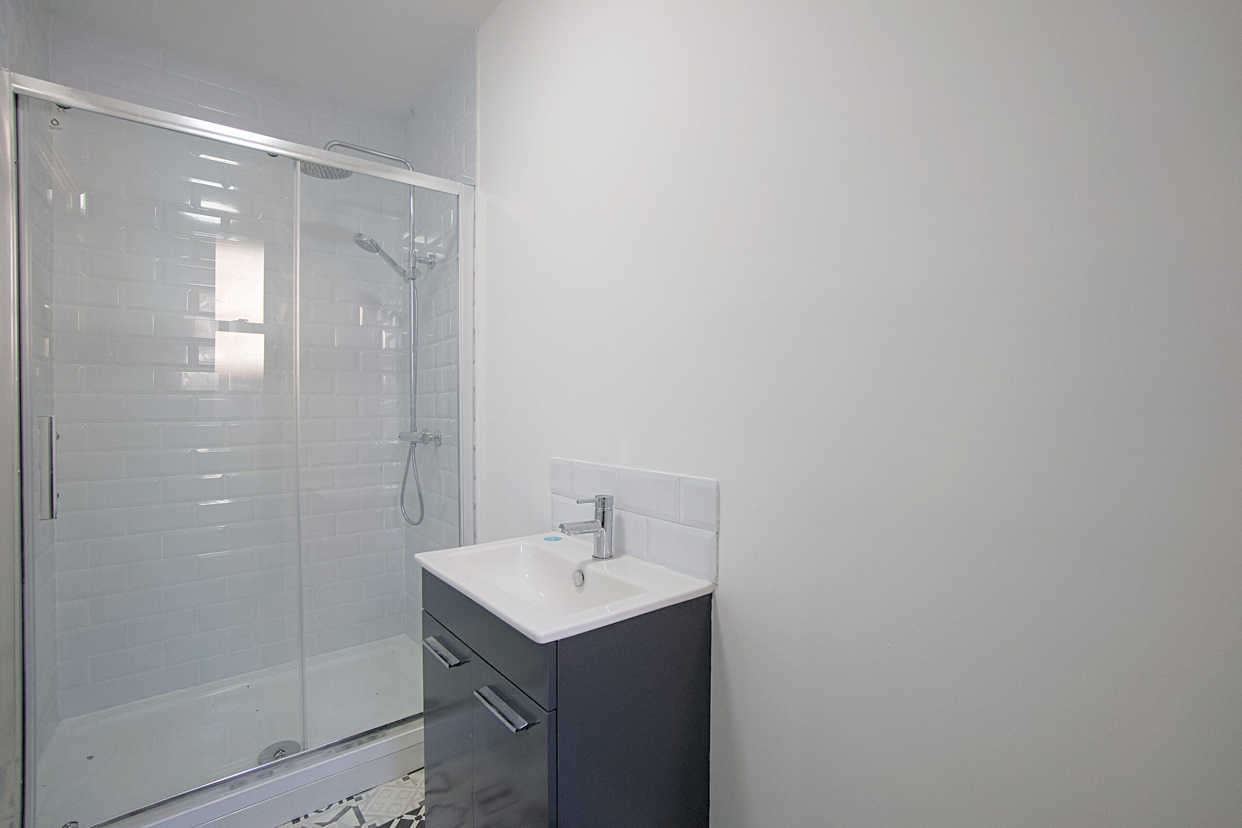 At the back of the property a shower room, with large metro tiled shower, cabinet sink and toilet.