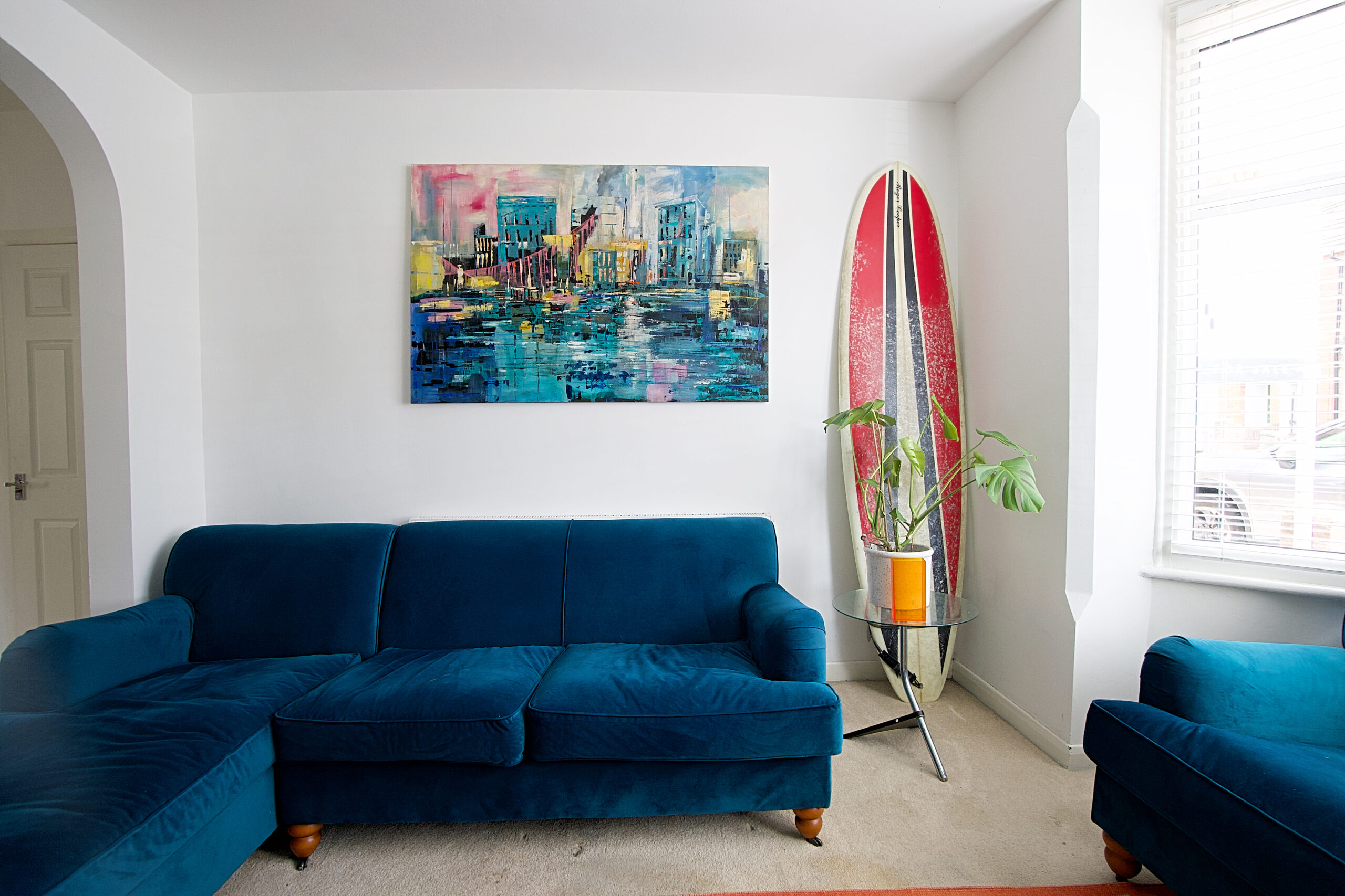 A modern white fronted kitchen is further back with breakfast bar and some built in appliances. There is extra storage with the understairs cupboard. The room is bright, as it has a south facing window.