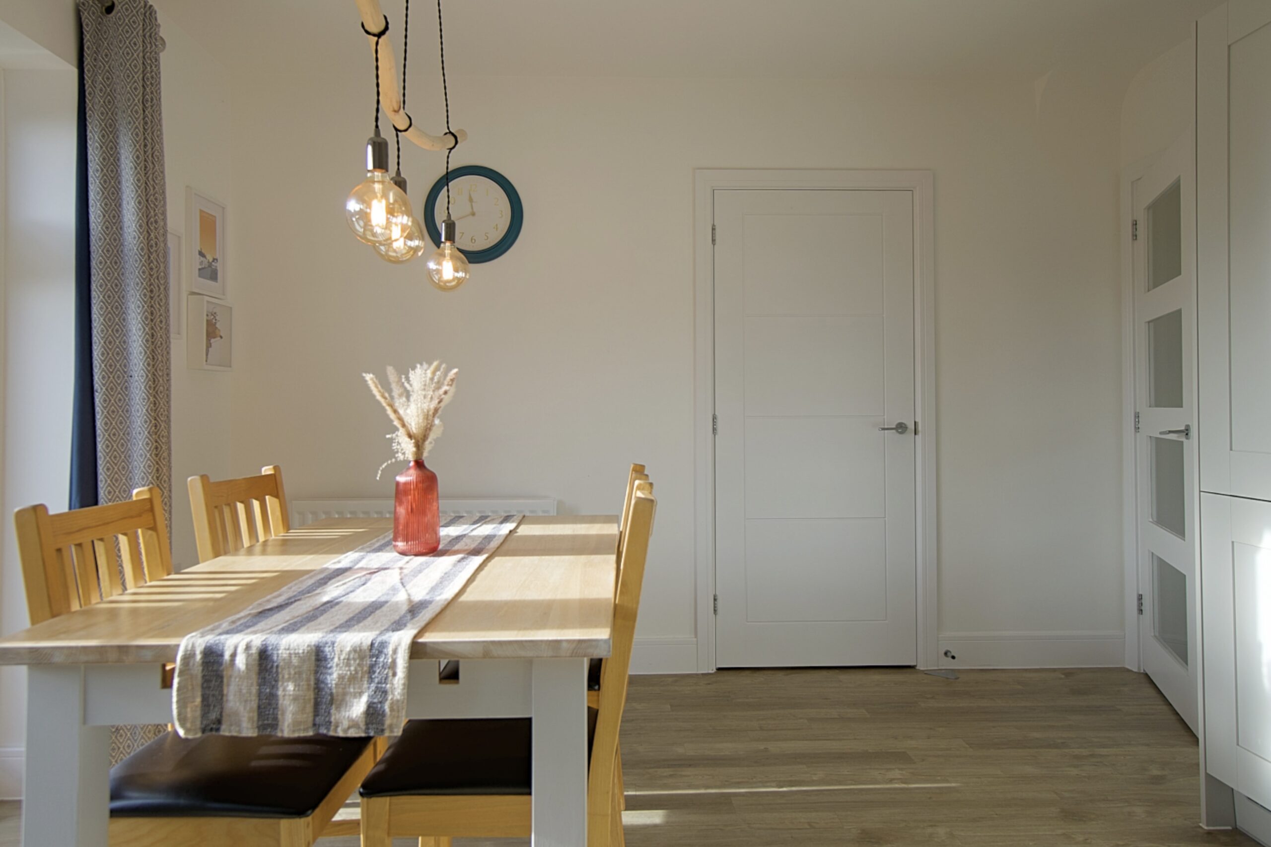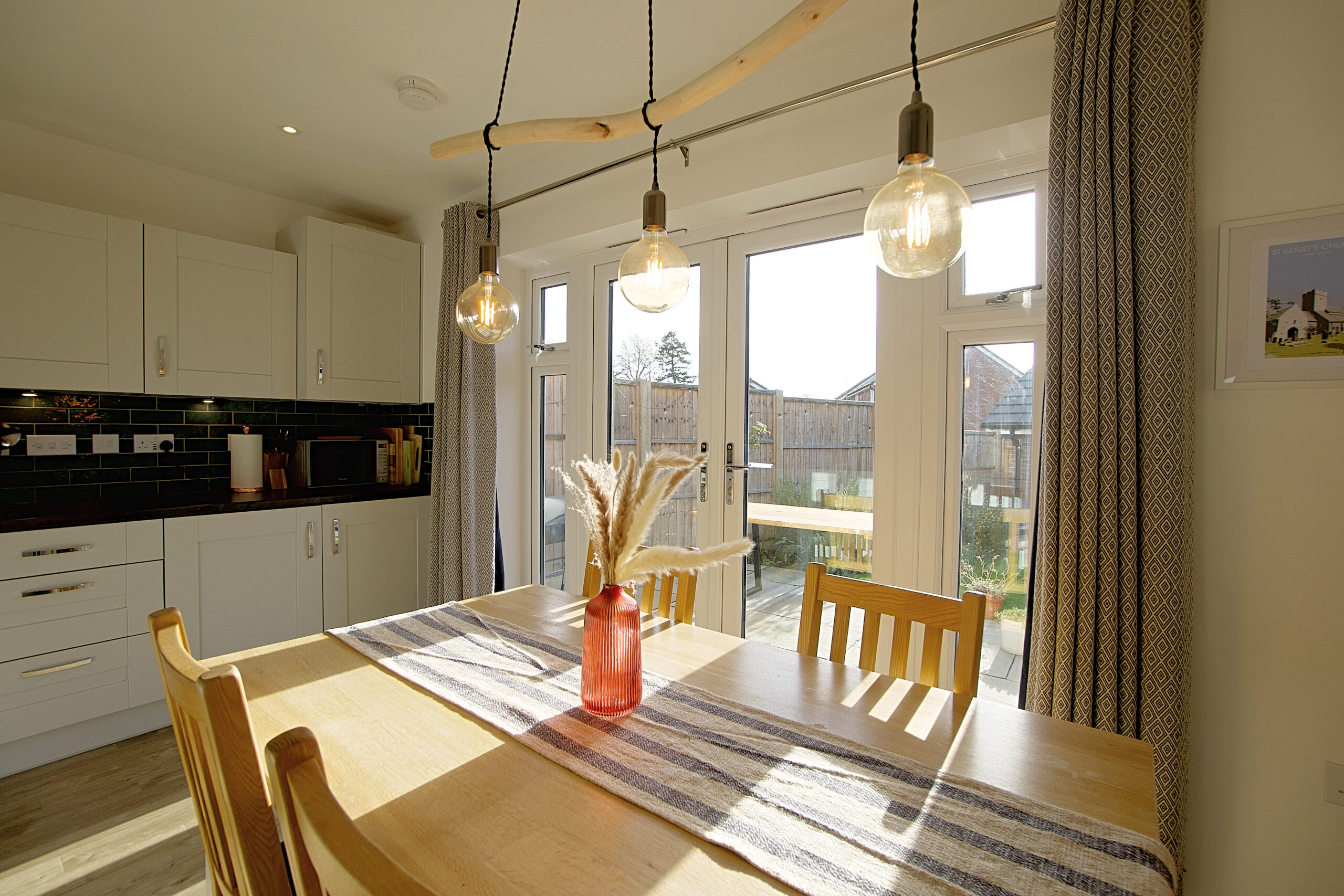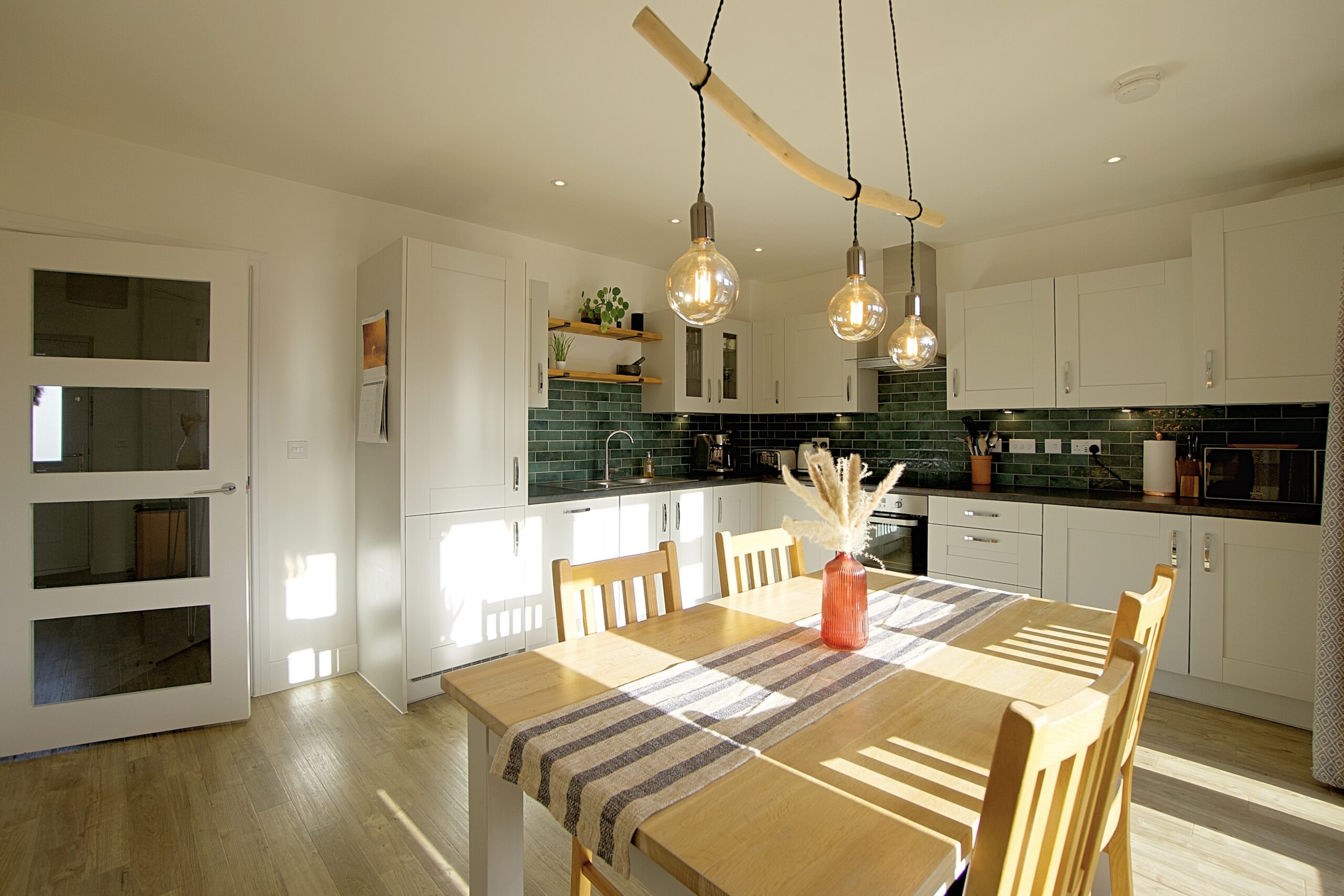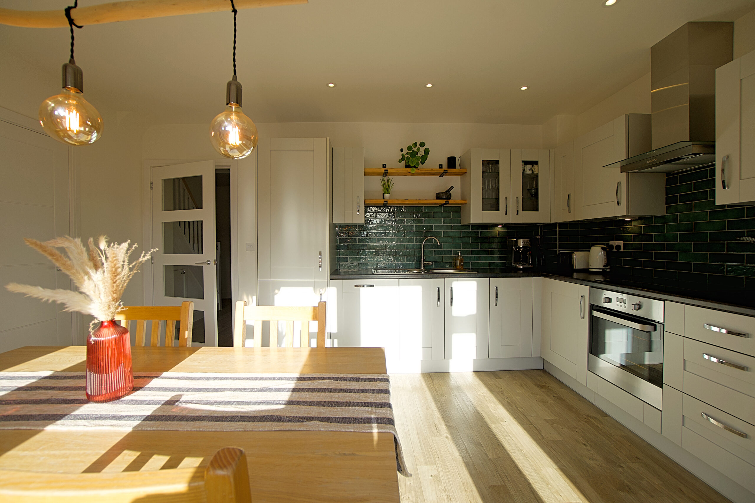At the back of the property a lovely kitchen dining room with additional shelving, integrated appliances and lovely green tiling. The room has space for a table and chairs with room to spare. The south facing French doors flood the room with natural light.