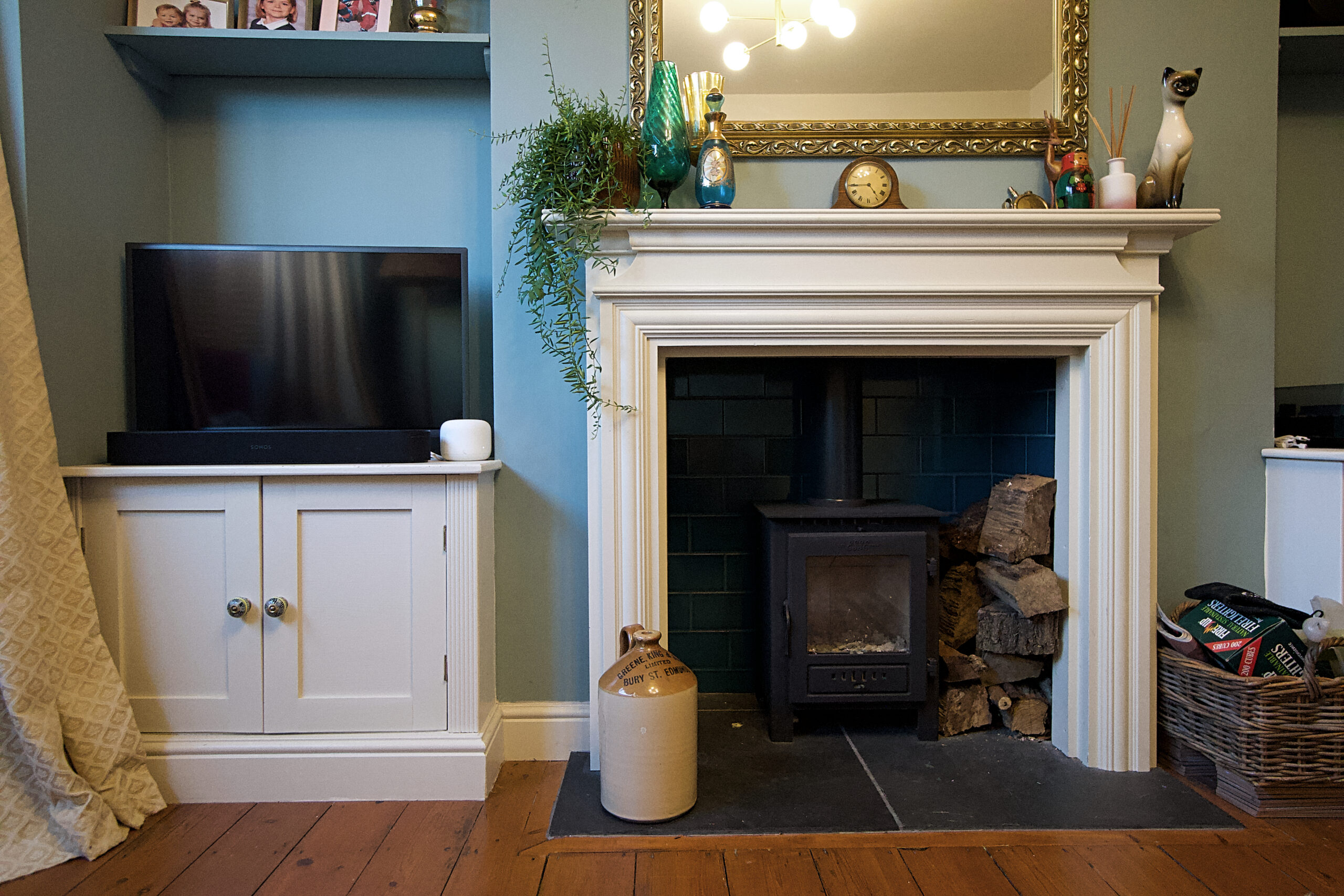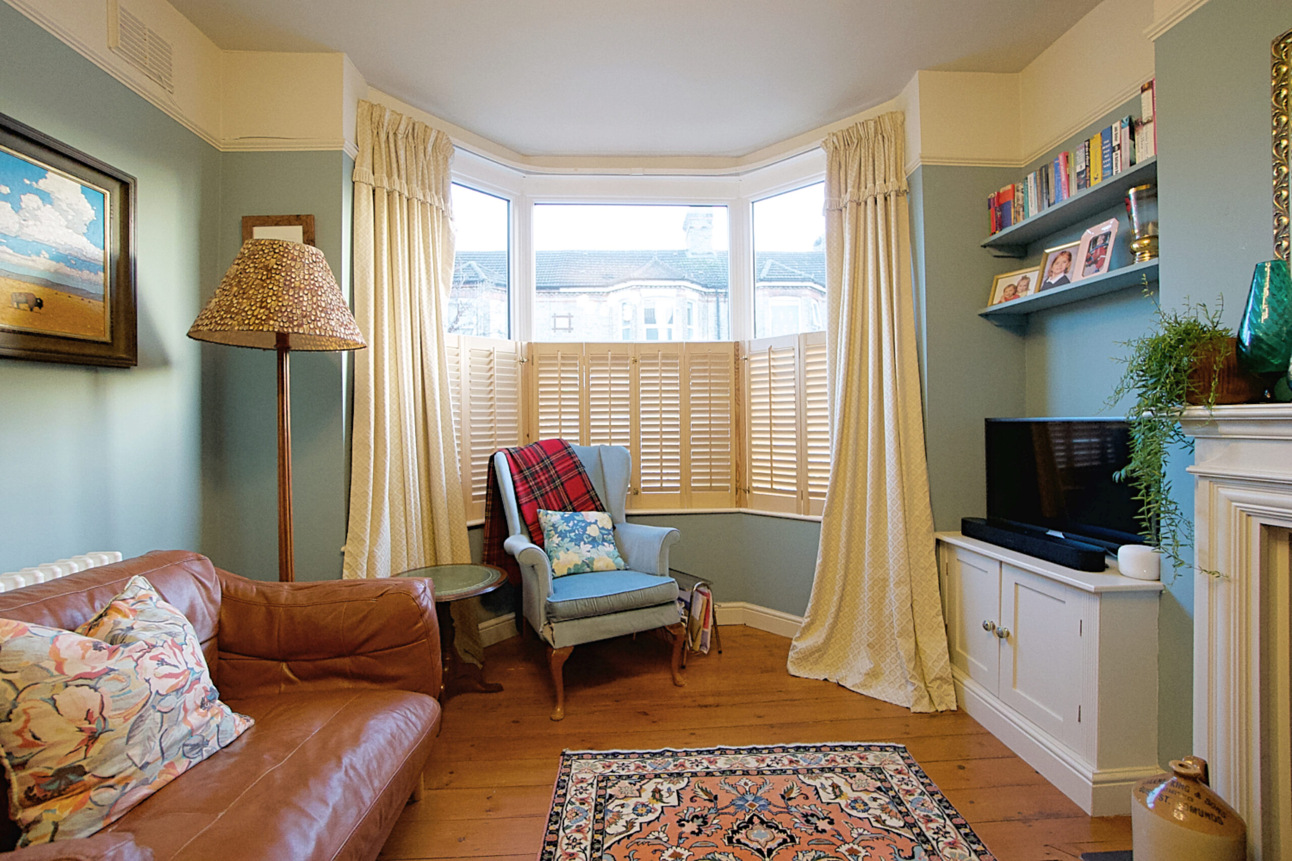 Iron railings, beautiful tiling, herringbone floor, wood burning stove, exposed floorboards, double bay window, plantation shutters and a wonderful open plan kitchen dining room.