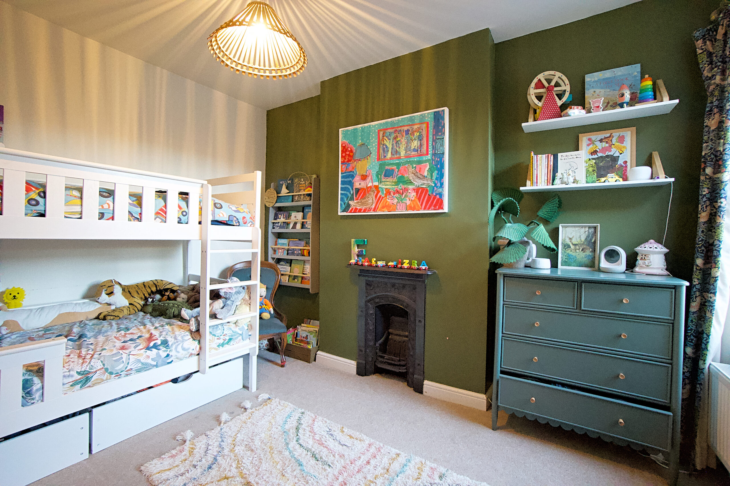 On the first floor, the main bedroom is a king size room, with drenched colour over the fireplace, wardrobes and walls. A chic bedroom with bay window and shutters to the outside world.