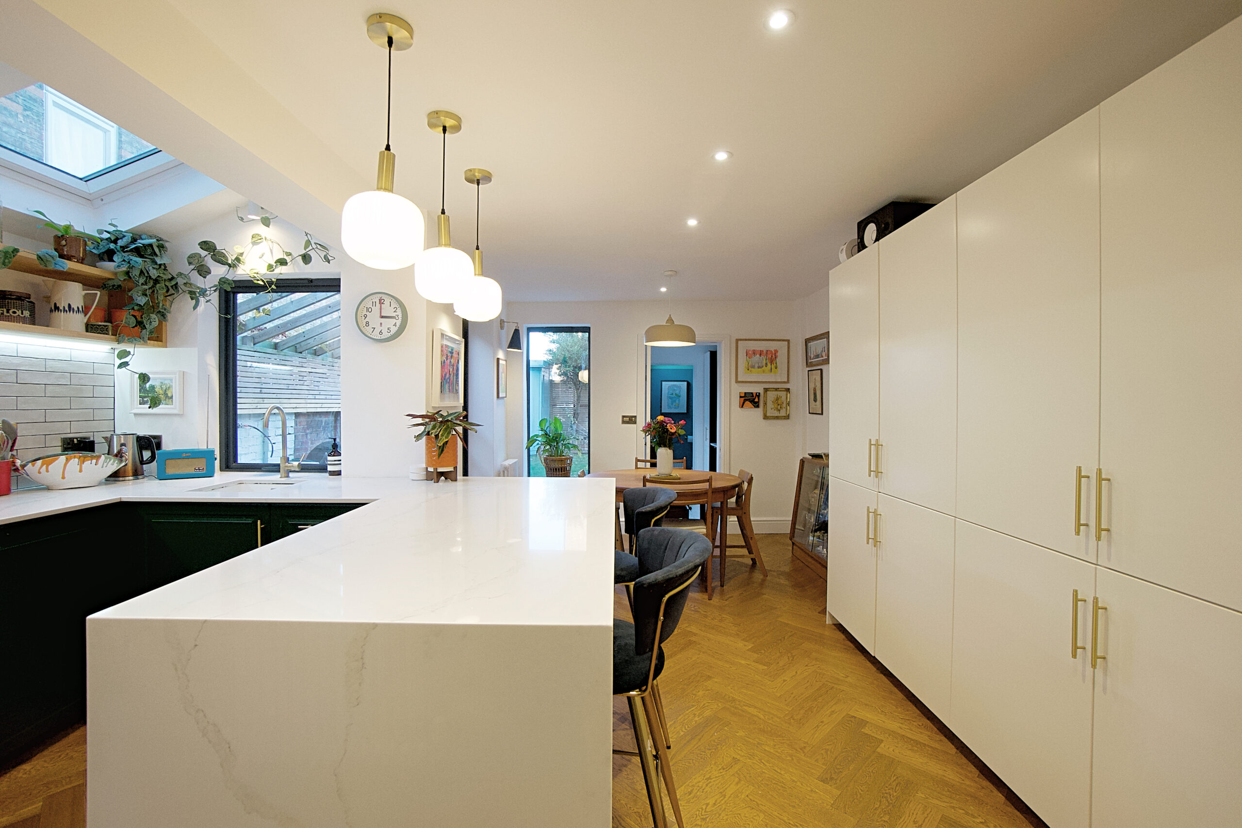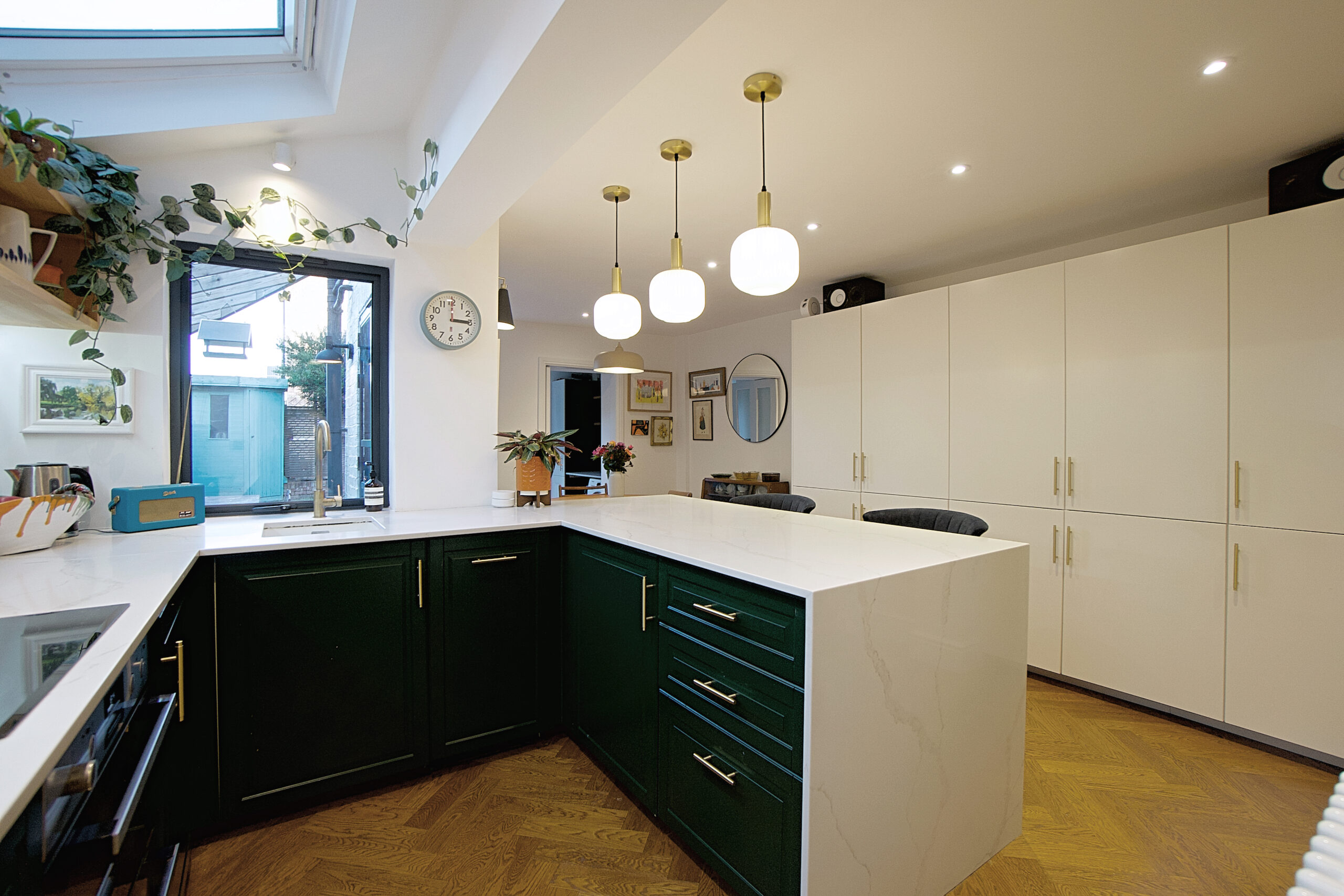 The snug/ playroom has a pretty fireplace and exposed brick wall, and is open to the wonderful kitchen area. Quartz marble style worktop and green cabinets. A peninsular with breakfast bar and three pendant lights hanging over. Behind, a bank of cupboards with concealed appliances and an abundance of storage. The dining room has anthracite French doors and a picture window to the garden and patio.